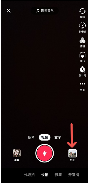 在此步骤中可以看到红色的"录制"按钮旁边有"相册"选项,点击“相册”。